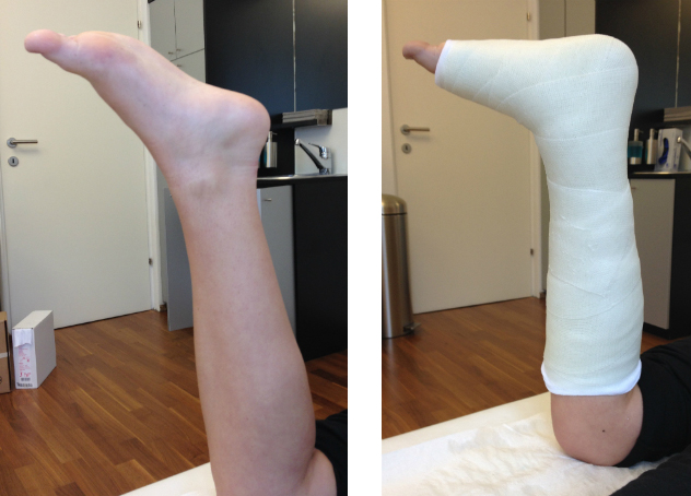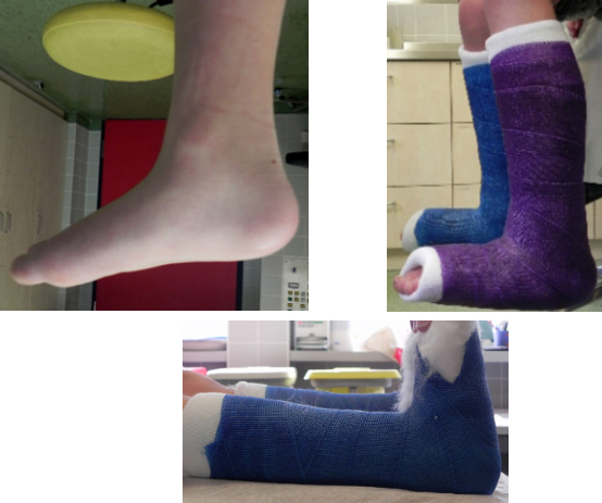 An obigem Bild-Beispiel ist gut ersichtlich, wie effektiv die kombinierte Technik mittels ultraschallgezielter Botulinum Toxin Injektion und der anschließenden Etappengipsanlage als Gehgips wirkt. Die Bilder zeigen links den initialen Befund vor der Botox Behandlung. Rechts findet sich das klinische Ergebnis nach einwöchiger Gipsbehandlung (mit dem bei dieser Kontrolle angelegten zweiten Gips). Danach wurde noch eine Unterschenkelschiene mit Gelenk und Gummizügeln verordnet.