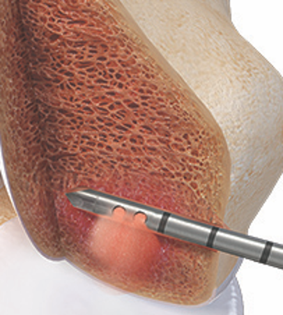 In seltenen Fällen ist in erster Linie das Knochengewebe unterhalb des Knorpels geschädigt (Fundament d. Knorpels). Dies äußert sich in einem lokalisierten Knochenmarködem (bone marrow lesions). In diesen Fällen kann die Therapie mittels Subchondroplastie angezeigt sein. Im Rahmen eines kleinen Eingriffes wird eine Hohlnadel (3mm Durchmesser) navigiert in den Knochen eingebohrt. Über diese Hohnadel wird dann pastöses Calcium-Phospohat in das geschwächte Knochenareal eingebracht. Es handelt sich dabei um einen künstlichen hergestellten Knochenersatzstoff welcher binnen Minuten aushärtet.