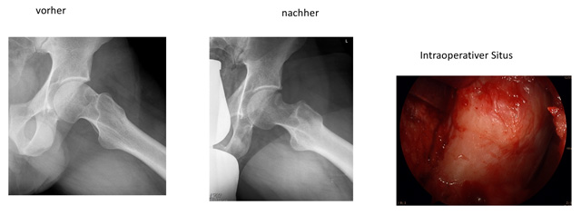 In den meisten Fällen wird die Taillierung des Schenkelhalses (Übergang Kopf-Hals des Oberschenkelknochens) chirurgisch verändert. Der Eingriff dauert in erfahrener Hand ca. 45 Minuten. Anschließend ist meist eine Teilbelastung von 6 Wochen notwendig. (In seltenen Fällen des Femoroacetabulären Impingements müssen zusätzlich auch noch weitere Techniken angewendet werden z. B.. Peri-Acetabuläre Osteotomie, siehe dort)