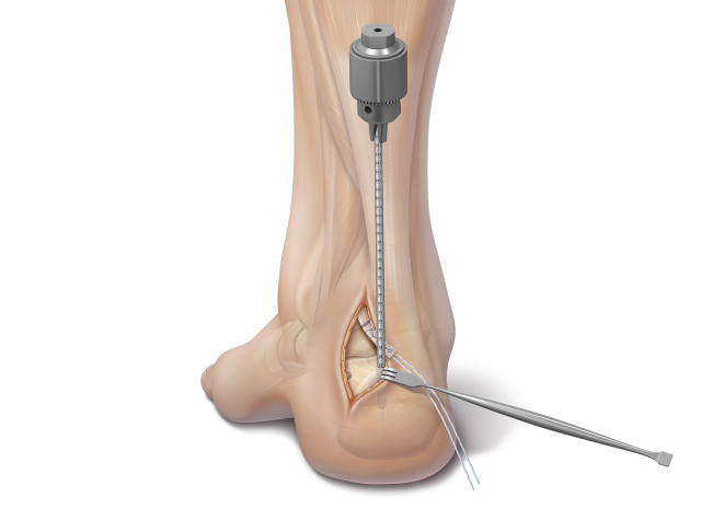 Bei Patienten mit Klumpfußfehlstellung z.B. nach Schlaganfällen oder anderen neurologischen Erkrankungen kann durch das Ablösen dieser Sehne am Kahnbein und den Transfer dieser Sehne auf den Fußrücken einerseits die pathologische Zugkraft erheblich reduziert und durch die Verlagerung in eine andere Zugrichtung gebracht werden, sodaß aus einer Beugesehne eine Strecksehne (Fußhebung) wird. Dabei wird die Sehne durch einen Tunnel zwischen Schien- und Wadenbein nach vorne vor das obere Sprunggelenk gezogen und über einen Anker oder einen Bohrkanal in einem der Keilbeine verankert.
