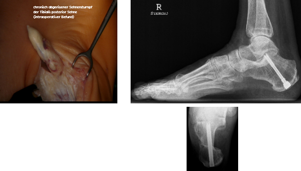 Bei der Operation muß die überdehnte und damit nicht mehr funktionstüchtige und manchmal chronisch abgerissene hintere Schienbeinsehne (M. tibialis posterior) ersetzt und zusätzlich durch eine Durchtrennung und Versetzung des Fersenbeines unterstützt werden. Mit einer anschließenden 4-6 wöchigen Gipsbehandlung und folgender Geh-Schienenversorgung von ca 3 Monaten ist davon auszugehen, daß der Erkrankungsverlauf komplett gestoppt werden kann.