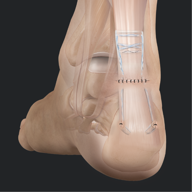 Bei Patienten mit Achillessehnenruptur, bei denen die Verletzung schon länger zurückliegt bzw das Sehnengewebe so stark zerstört ist, daß eine direkte Naht praktisch nicht suffizient ist, kann mittels arthroskopischer Technik als Ersatzmuskel die Flexor hallucis longus Sehne (lange Beugesehne des Großzehens) verwendet werden. Dieser Muskel wird über ein spezielles Fadensystem in einem Bohrkanal am Fersenbein neben der Ansatzstelle der Achillessehne fixiert.