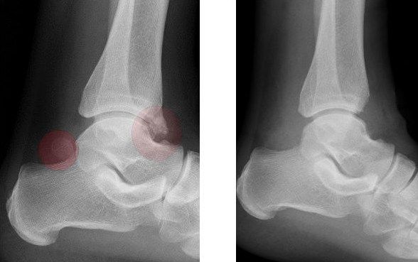 Röntgenbild eines Sprunggelenkes vor und nach Entfernung eines os trigonum und eines knöchernen Sporns (Osteophyt) - beides rot eingekreist