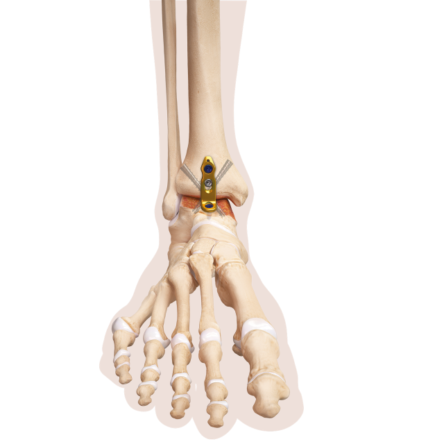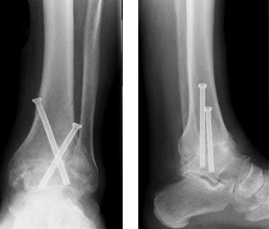 Im hinteren Fuß- bzw Sprunggelenksbereich sind an erster Stelle die operative Versteifung des oberen Sprunggelenkes zu nennen. Diese wird meistens bei Abnützungen, bei Instabilitäten oder auch bei Fehlstellungen wie einem fixierten Spitzfuß oder auch dem Fallfuß durchgeführt. Wenn möglich, wird diese Versteifung durch uns mittels arthroskopischer Technik vorgenommen. Dies bietet den Vorteil eines sehr geringen Wundrisikos. Auch die Zeit, bis eine stabile knöcherne Situation resultiert, kann damit verkürzt werden.