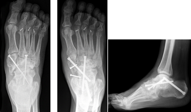 Auch im mittleren Fußbereich sind teilweise Versteifungen bei symptomatischen Abnützungen notwendig. Da sich in diesem Bereich die größte Krümmung der Fußwölbung befindet, ist auch in dieser Gelenksregion postoperativ die Nachbehandlung mittels Gips obligat.